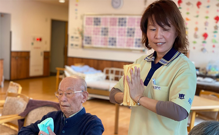 | レクリエーション | ご利用者様の興味のある活動や趣味に応じて、様々な内容のレクリエーションを用意しています。また、レクリエーションはリハビリテーションの一環にもなっており、楽しみながら、腕や足の筋力、心肺機能やバランス能力、認知機能などのリハビリを行っています。(クリエーション一覧)輪投げ・スカットボール・ボーリング・風船バレー・棒サッカーまちがい探し・クイズ・ナンプレ・漢字問題・計算問題・将棋・書道・オセロ・作業活動・編み物・塗り絵等 |